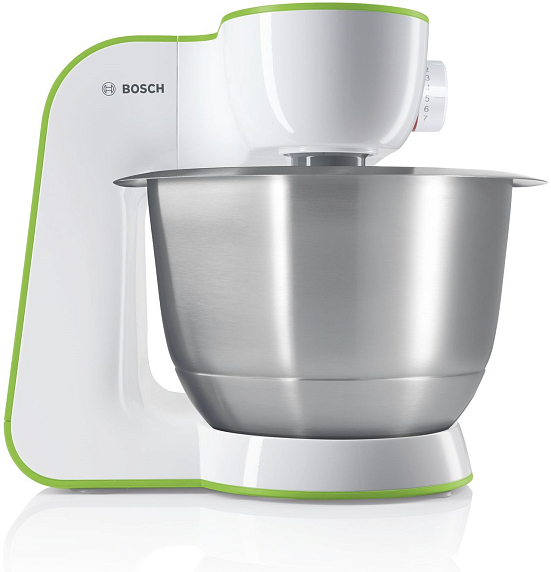 Кухонный комбайн Bosch MUM 54G00 оснащен вместительной чашей из частично полированной нержавеющей стали объемом 3,9л. За один раз вы сможете заместить 2 кг крутого теста.