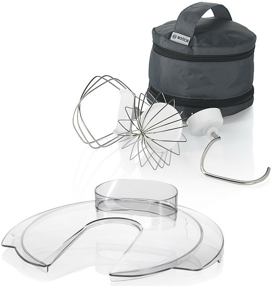 Кухонный комбайн Bosch MUM 54I00 оснащен большой чашей из нержавеющей стали для замешивания теста, быстрого взбивания крема и сливок. Объем чаши 3,9л позволяет замесить до 2 кг плотного теста. В комплекте — два венчика и крюк для теста, для их хранения предусмотрена небольшая сумка, которая хранится в чаше комбайна.