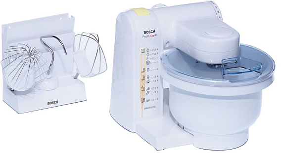 Кухонный комбайн Bosch MUM4600 белого цвета. Многофункциональный прибор подойдет для приготовления множества рецептов.