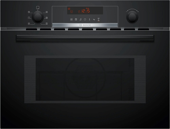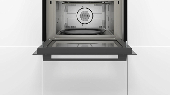 Встраиваемая микроволновая печь Bosch CMA583MB0 демонстрирует сдержанную элегантность и строгие линии, которые легко вписываются в современную кухонную обстановку благодаря черному декоративному оформлению. Корпус и фасад разработаны с прицелом на аккуратную интеграцию в мебельный гарнитур: глубина и ширина соответствуют типовым нишам, а высота оставляет достаточно пространства для установки в колонну или над духовым шкафом. Откидная дверца с нижним упором и удобной ручкой обеспечивает привычный доступ к рабочей камере, а лаконичный дизайн фасада визуально расширяет пространство, не перегружая интерьер лишними деталями.
