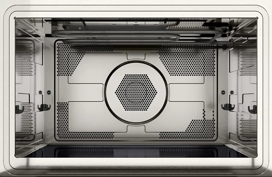 Объём рабочей камеры 44 литра и её внутренние габариты 22 х 42 х 42 см дают достаточно пространства для больших блюд и противней; камера выполнена из нержавеющей стали, что упрощает уход и повышает гигиеничность. Откидная дверца с ручкой и нижним дверным упором рассчитана на длительную эксплуатацию, обеспечивает удобный доступ к содержимому. Светодиодное освещение рабочей зоны делает процесс наблюдения за приготовлением комфортным и экономичным по энергопотреблению. Для гриля предусмотрена решётка, а нагрев выполняется тэновым элементом, что даёт равномерный подрумянивающий эффект.