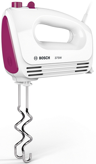 Миксер Bosch MFQ 2210P — легкий и комфортный в использовании. В комплекте прилагаются две стандартные насадки, которые можно мыть в посудомоечной машине: венчики для взбивания и крюки для замешивания теста. Работает на четырех скоростях, импульсный режим включается специальной кнопкой.