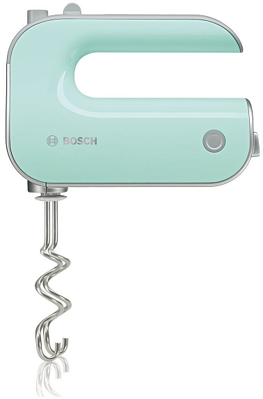 Мощный дизайнерский миксер Bosch MFQ 40302 отличается необычной формой, благодаря резиновым вставкам на ручке его удобно держать. Насадки выполнены из нержавеющей стали, их замена осуществляется нажатием на кнопку.