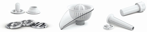 Сколько же насадок идет в комплекте! И каждая на свое место. Я уже успела приготовить домашние колбаски, использовав специальную насадку, и сделать фарш разной консистенции благодаря формовочным дискам. И все это на двух скоростях - для разных видов работ. Ну и конечно, отдельно хочу отметить пресс для отжима сока - очень удобная вещь, особенно в сезон свежих фруктов и овощей!