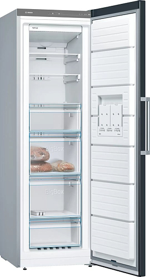 Отдельностоящий морозильник Bosch GSN36VBFP оснащен ящиком BigBox он отлично подходит для крупных продуктов, туда может уместиться целый торт. Технология FreshSense не замораживает до состояния льда, например мороженное не будет слишком твердым или слишком мягким. Система NoFrost на стенках внутренней камере устройства не будет образовываться лед.