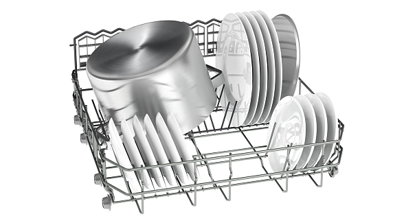 Переставляемый по высоте верхний короб системы Rackmatic и Rackmatic-3 создан для размещения габаритной посуды в нижней корзине посудомоечных машин. Чтобы правильно уложить высокие кастрюли можно поднять верхний короб даже при его полной загрузке на 5 см. Обычно этой высоты вполне хватает для нестандартной посуды. При этом качество мытья останется таким же хорошим.