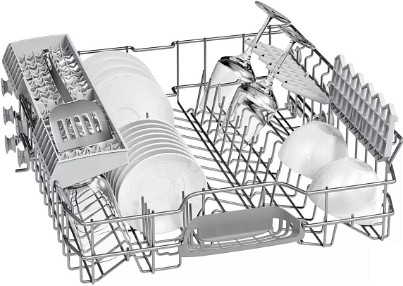 Посудомоечная машина Bosch SMS44DI01T — отдельностоящая модель, выполненная в сером цвете. С помощью функции VarioSpeed продолжительность выполнения программы может быть укорочена на 20-50%. IntensiveZone позволяет превосходно вымыть одновременно посуду различного вида и степени загрязнения. Половинная загрузка потребуется, если у вас небольшое количество тарелок и кружек. При этом экономится вода, время и электроэнергия.