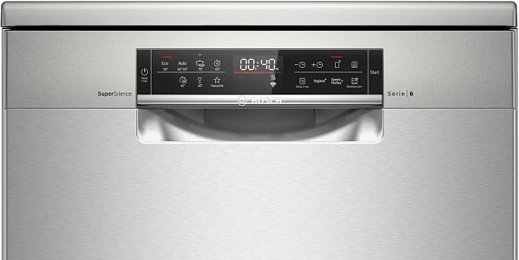Функциональность расширяют HygienePlus для глубокого обеззараживания, IntensiveZone для усиленного мытья в нижней корзине и SpeedPerfectPlus для быстрого завершения с сохранением качества. Программа Machine Care поддерживает устройство в оптимальном состоянии, продлевая срок эксплуатации. Для удобства пользователей предусмотрены индикаторы наличия ополаскивателя, соли и времени до окончания цикла, а также таймер отсрочки запуска от 1 до 24 часов и звуковой сигнал завершения. Подключение по Home Connect позволяет запускать технику удаленно через приложение на смартфоне, что даёт гибкость управления и интеграцию с умным домом.