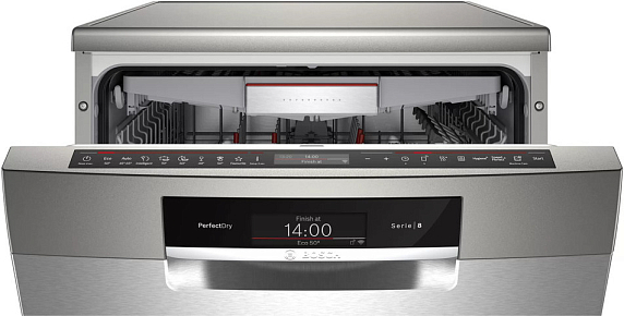 Посудомоечная машина Bosch SMS8YCI03E - это отдельностоящая, полноразмерная модель, выполненная в стильном дизайне из нержавеющей стали. Она принадлежит к серии Serie | 8 и оснащена инверторным двигателем EcoSilence Drive, который обеспечивает тихую и эффективную работу. Эта модель способна разместить до 14 комплектов посуды, что делает ее идеальным выбором для больших семей или активно приглашающих гостей хозяев. Машина оборудована восемью стандартными программами и пятью температурными режимами, включая быструю, экономичную, интенсивную, ночную и специальную программу для стекла при 40 градусах. Это позволяет подобрать наиболее подходящий режим для любого типа посуды. Система HygienePlus гарантирует высокий уровень гигиены, уничтожая до 99,9% бактерий и микробов. Особенностью данной модели является функция VarioSpeedPlus, которая позволяет сократить время мойки в три раза без потери качества. Также стоит отметить функцию Extra Dry, обеспечивающую идеальную сушку даже для трудносушимой посуды, такой как пластиковые изделия. Технология защиты стекла печет о сохранении блеска стеклянной посуды и предотвращения ее повреждения.