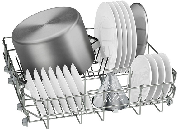 Переставляемый по высоте верхний короб системы Rackmatic и Rackmatic-3 создан для размещения габаритной посуды в нижней корзине посудомоечных машин. Чтобы правильно уложить высокие кастрюли можно поднять верхний короб даже при его полной загрузке на 5 см. Обычно этой высоты вполне хватает для нестандартной посуды. При этом качество мытья останется таким же хорошим.