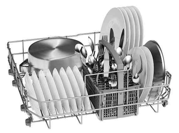 Посудомоечная машина Bosch SMV25BX04R относится к встраиваемым полноразмерным, поэтому панель управления этого товара размещена на торцевой части. Вместительность устройства составляет 13 комплектов, поэтому семья из 3-4 человек может запускать цикл очистки лишь раз в сутки.