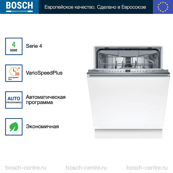 ** Все информационные материалы, представленные на Сайте, носят справочный характер и не могут в полной мере передавать достоверную информацию о свойствах, комплектации и характеристиках товара, включая цвета, размеры и формы. Фирма-производитель оставляет за собой право на внесение изменений в конструкцию, дизайн и комплектацию товара без предварительного уведомления. Перед оформлением Заказа Покупатель должен обратиться к Продавцу для уточнения свойств и характеристик Товара. Подробная информация о товаре указывается в инструкции и на упаковке товара. Используемое название в России: Бош SMV46KX04E