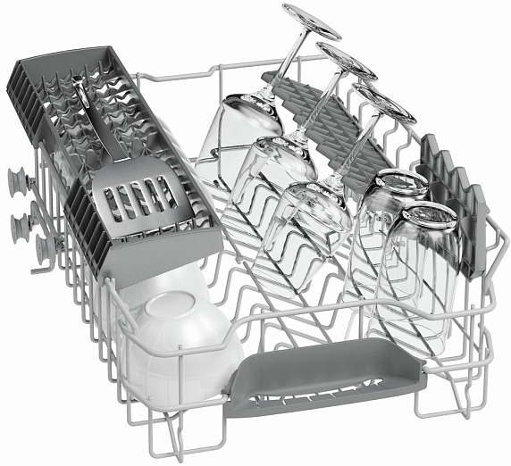 Посудомоечная машина Bosch SPS25CW02R оборудована 5 стандартными программами и функцией ГигиенаПлюс, которая предусматривает дополнительное ополаскивание горячей водой. Это очень удобно для семей, где есть дети и аллергики. Технология бережного мытья стекла обеспечивает сохранность бокалов.