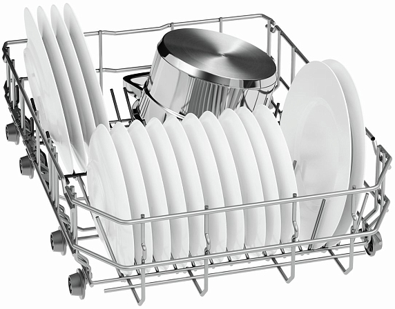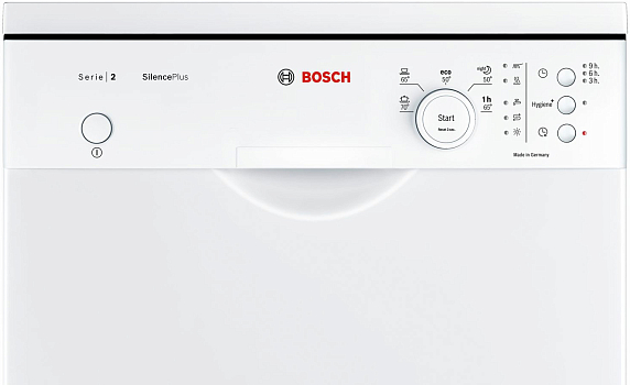 Посудомоечная машина Bosch SPS25FW12R — узкая отдельностоящая модель с пятью программами и специальными режимами VarioSpeed и Гигиена Плюс. Благодаря системе Rackmatic-3 можно легко регулировать высоту даже загруженного верхнего короба, чтобы расположить внизу кастрюли и противни.