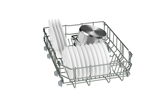 Переставляемый по высоте верхний короб системы Rackmatic и Rackmatic-3 создан для размещения габаритной посуды в нижней корзине посудомоечных машин. Чтобы правильно уложить высокие кастрюли можно поднять верхний короб даже при его полной загрузке на 5 см. Обычно этой высоты вполне хватает для нестандартной посуды. При этом качество мытья останется таким же хорошим.
