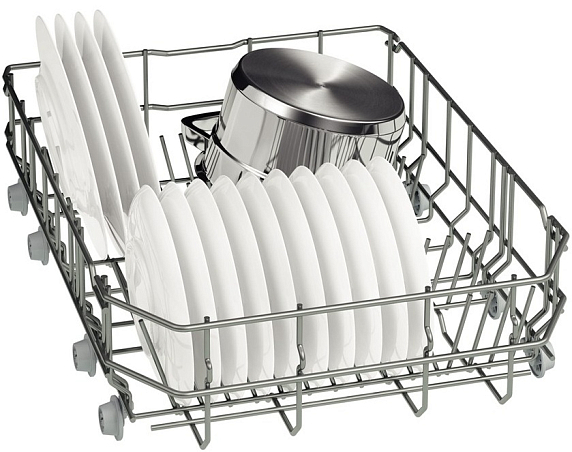 Переставляемый по высоте верхний короб системы Rackmatic и Rackmatic-3 создан для размещения габаритной посуды в нижней корзине посудомоечных машин. Чтобы правильно уложить высокие кастрюли можно поднять верхний короб даже при его полной загрузке на 5 см. Обычно этой высоты вполне хватает для нестандартной посуды. При этом качество мытья останется таким же хорошим.