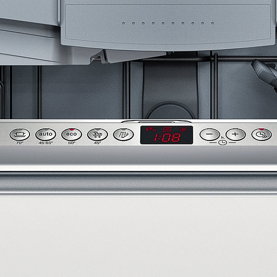 Дисплей в посудомоечной машине расположен вверху фронтальной части и помогает с настройками, а также в коммуникации с устройством. Отображение текста представлено двумя строками с шестью символами в каждой.