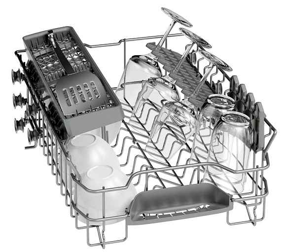 Посудомоечная машина Bosch SPV25CX00E оснащена системой защиты от протечек AquaStop, которая обеспечивает безопасность использования прибора. Индикатор InfoLight поможет вам определить работает ли в данный момент модель. Верхний короб можно отрегулировать по высоте в зависимости от размера посуды.