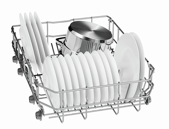 Переставляемый по высоте верхний короб системы Rackmatic и Rackmatic-3 создан для размещения габаритной посуды в нижней корзине посудомоечных машин. Чтобы правильно уложить высокие кастрюли можно поднять верхний короб даже при его полной загрузке на 5 см. Обычно этой высоты вполне хватает для нестандартной посуды. При этом качество мытья останется таким же хорошим.