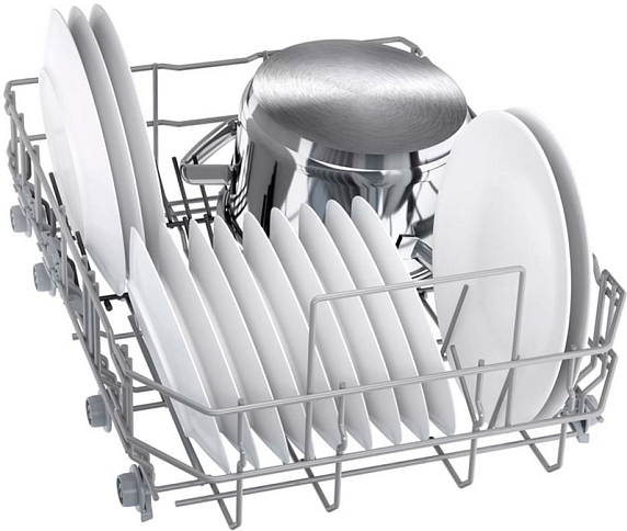Переставляемый по высоте верхний короб системы Rackmatic и Rackmatic-3 создан для размещения габаритной посуды в нижней корзине посудомоечных машин. Чтобы правильно уложить высокие кастрюли можно поднять верхний короб даже при его полной загрузке на 5 см. Обычно этой высоты вполне хватает для нестандартной посуды. При этом качество мытья останется таким же хорошим.