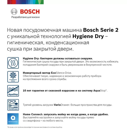 ** Все информационные материалы, представленные на Сайте, носят справочный характер и не могут в полной мере передавать достоверную информацию о свойствах, комплектации и характеристиках товара, включая цвета, размеры и формы. Фирма-производитель оставляет за собой право на внесение изменений в конструкцию, дизайн и комплектацию товара без предварительного уведомления. Перед оформлением Заказа Покупатель должен обратиться к Продавцу для уточнения свойств и характеристик Товара. Подробная информация о товаре указывается в инструкции и на упаковке товара. Используемое название в России: Бош SMS2HMW1CR