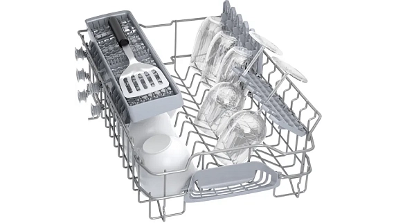 Переставляемый по высоте верхний короб системы Rackmatic и Rackmatic-3 создан для размещения габаритной посуды в нижней корзине посудомоечных машин. Чтобы правильно уложить высокие кастрюли можно поднять верхний короб даже при его полной загрузке на 5 см. Обычно этой высоты вполне хватает для нестандартной посуды. При этом качество мытья останется таким же хорошим.