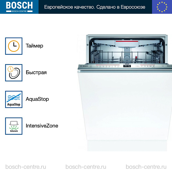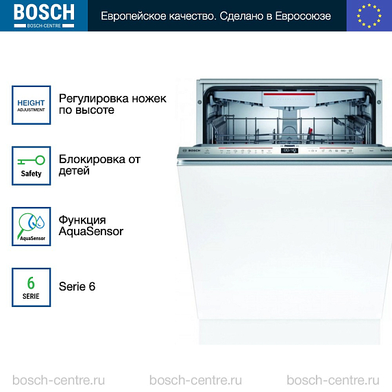 Встраиваемая посудомоечная машина Bosch SBD6ECX57E оснащена полной защитой от протечек, в случае утечки произойдет полное перекрытие воды. Имеется луч на полу InfoLight, он означает что устройство работает. Функция Home connect позволяет дистанционно отслеживать состояние вашего прибора и задавать настройки.