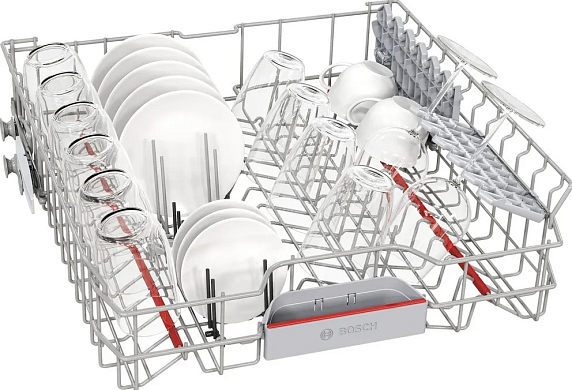 Также есть возможность удаленного запуска через приложение на смартфоне благодаря функции Home Connect. Индикаторы на панели информируют о наличии ополаскивателя и соли, а также о времени до окончания программы. Внутри машины три корзины для посуды, верхняя из которых переставляется по высоте для удобства размещения различных предметов. Блокировка от детей делают использование машины безопасным. Встроенный предохранительный клапан предотвращает возможные неполадки.