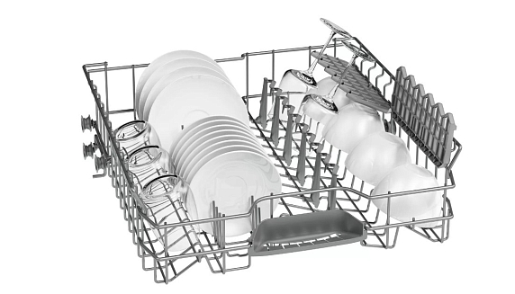 4. Распределяйте посуду равномерно: крупные предметы размещайте в нижней корзине, а хрупкие или легкие (например, стаканы) — в верхней. Не перегружайте корзины, чтобы струи воды могли эффективно очищать поверхности.