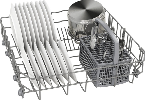 Верхняя корзина оснащена двумя полочками для чашек, а в нижней есть специальные направляющие для тарелок и корзина для столовых приборов. Машина предлагает четыре стандартных программы мытья и три температурных режима, включая быструю, экономичную и интенсивную.