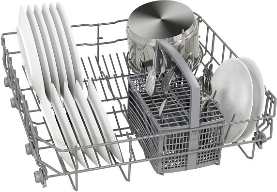 Внутренний резервуар выполнен из нержавеющей стали, что гарантирует долговечность и устойчивость к коррозии, а также способствует поддержанию гигиеничности. Машина рассчитана на загрузку до 13 комплектов посуды, что позволяет справляться с большими объемами работы. Три корзины, включая верхний короб с двумя полочками для чашек и нижний с корзиной для столовых приборов, обеспечивают удобную организацию посуды и максимальное использование пространства. Встроенная система AquaStop с полной защитой от протечек обеспечивает безопасность эксплуатации, предотвращая возможные повреждения кухни и техники в случае аварий. Технология сушки на основе теплообменника позволяет эффективно высушивать посуду, минимизируя энергозатраты и сохраняя качество обработки. Экстра-сушка и режим HygienePlus обеспечивают дополнительный уровень гигиены и сухости, что особенно важно для семей с маленькими детьми или аллергиками. Нагревательный элемент проточного типа обеспечивает быстрый и равномерный нагрев воды, а функция самоочистки фильтра упрощает уход за машиной и поддерживает ее работоспособность на высоком уровне. Сенсор чистоты воды AquaSensor автоматически регулирует процесс мытья, адаптируя его под степень загрязнения, что помогает экономить ресурсы и повышает эффективность.
