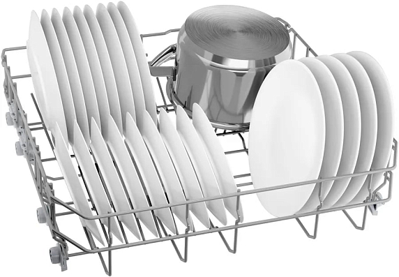 Переставляемый по высоте верхний короб системы Rackmatic и Rackmatic-3 создан для размещения габаритной посуды в нижней корзине посудомоечных машин. Чтобы правильно уложить высокие кастрюли можно поднять верхний короб даже при его полной загрузке на 5 см. Обычно этой высоты вполне хватает для нестандартной посуды. При этом качество мытья останется таким же хорошим.