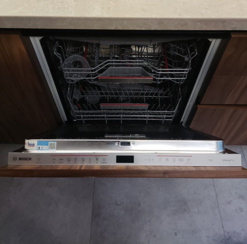 Управление осуществляется через закрытую панель с сенсорными кнопками и дисплеем. Также доступен удаленный запуск через приложение на смартфоне благодаря функции Home Connect. Индикаторы наличия ополаскивателя и соли, а также времени до окончания программы помогают контролировать процесс мойки. Луч на полу TimeLight отображает оставшееся время до окончания программы. Посудомоечная машина оснащена системой AquaStop, которая предотвращает протечки, и частичной защитой от протечек. Внутренний резервуар выполнен из нержавеющей стали, что гарантирует долговечность и надежность машины.