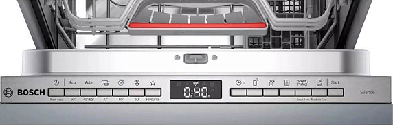 Дисплей в посудомоечной машине расположен вверху фронтальной части и помогает с настройками, а также в коммуникации с устройством. Отображение текста представлено двумя строками с шестью символами в каждой.