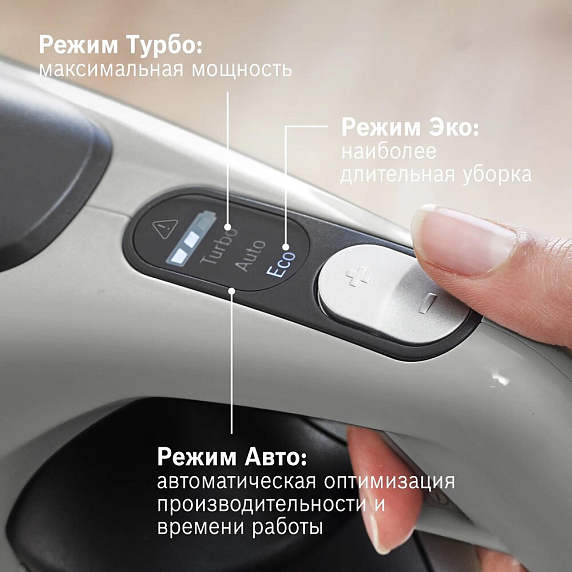 Пылесос Bosch BCS82G31 оснащен съемным универсальным аккумулятором Power for ALL 18 В, он подходит для разных приборов и держит время подзарядки до 45 минут. Имеется турбощетка HighPower с LED подсветкой, она отлично справляется с любыми напольными покрытиями. Также есть режим авто, он будет регулировать мощность работы в зависимости от напольного покрытия.