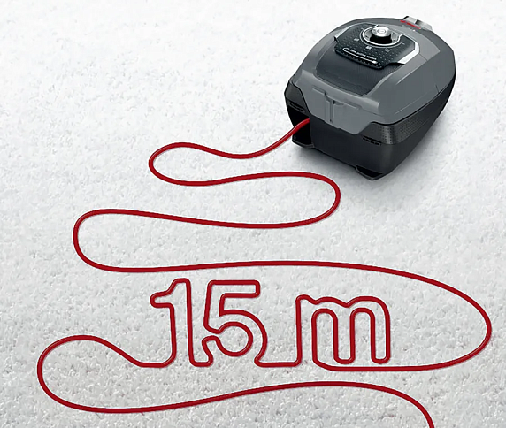 Пылесос оснащен четырьмя колесами для удобства перемещения и автосматыванием сетевого шнура. Радиус действия составляет 15 метров, что позволяет убирать большие помещения без необходимости переключения розеток. Потребляемая мощность устройства составляет 1800 Вт, что обеспечивает его высокую производительность.