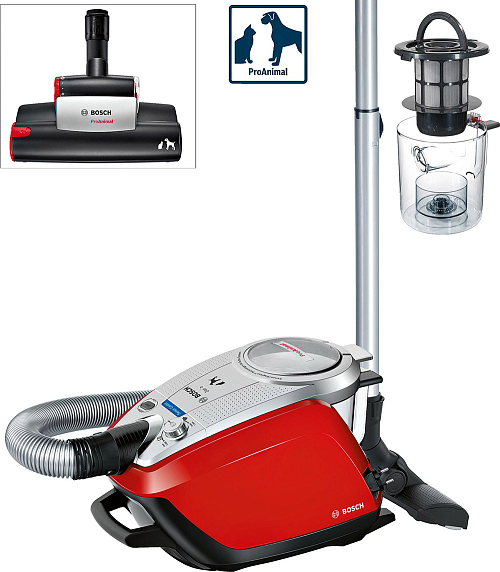 Пылесос Bosch BGS5335 выполнен в красном цвете и оснащен турбощеткой ProAnimal, подходящей для сбора пыли и шерсти.