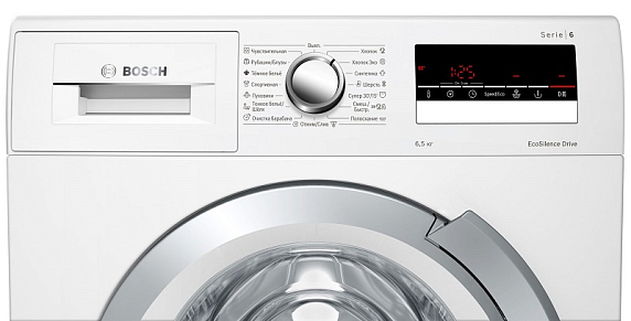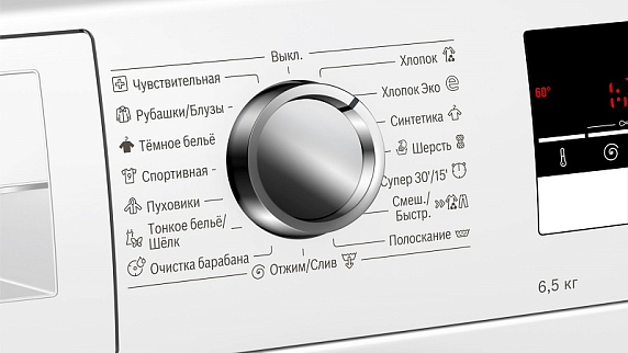 Управление прибором осуществляется при помощи поворотного переключателя, сенсорных кнопок Touch Control и большого многофункционального LED-дисплея. За счет таких функций как блокировка от детей, контроль пенообразования, подавление дисбаланса при отжиме и многоступенчатая защита от протечек достигается безопасная и комфортная эксплуатация.