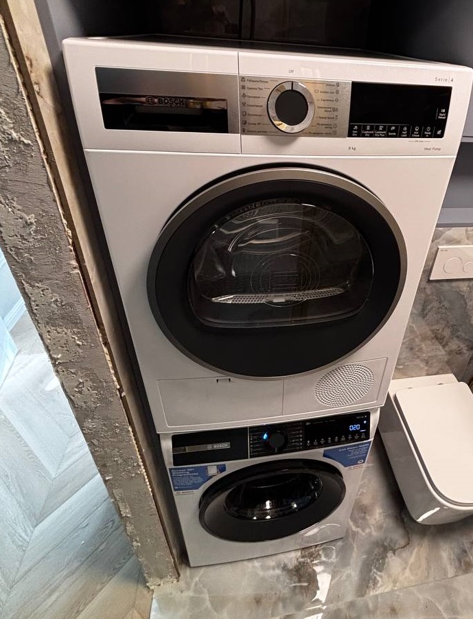 Стиральная машина Bosch WGK244Z0ME имеет элегантный белый корпус он сочетает минималистичную эстетику с практичностью: лаконичные линии, компактные габариты (высота 84.5 см, ширина 59.8 см, глубина 59 см) и продуманная фронтальная загрузка делают прибор универсальным решением для современного интерьера. При глубине с открытой дверцей 104.9 см загрузочный люк удобен для закладки и выгрузки громоздких предметов, а вместимость до 9 килограммов позволяет обрабатывать крупные партии белья за цикл, сохраняя баланс между объёмом и качеством ухода.