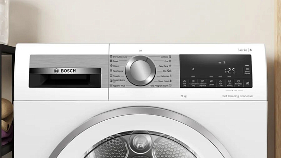 Сушильная машина Bosch WQG24591BY сочетает лаконичную белую отделку с продуманными линиями корпуса и декоративными элементами, которые делают прибор уместным в любом интерьере. Панель управления выполнена в современном электронном стиле: крупный многофункциональный LED-дисплей даёт ясную информацию о ходе цикла и оставшемся времени, а комбинация поворотного переключателя и сенсорных Touch control обеспечивает интуитивное управление. Дверца с навесом справа открывается плавно, упрощая загрузку и выгрузку белья, а внутренняя подсветка барабана из нержавеющей стали позволяет контролировать состояние ткани в процессе высушивания. Боковые панели с дизайном AntiVibration сокращают вибрацию и шум, делая работу менее заметной в жилом пространстве.