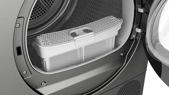 Технологическая начинка сосредоточена вокруг энергоэффективной конденсационной системы с тепловым насосом: аппарат аккуратно извлекает влагу, возвращая часть тепла в процесс и снижая потребление, что подтверждено классом энергопотребления C и максимальной нагрузкой 9 кг. Контейнер для конденсата присутствует, но при необходимости предусмотрен вывод воды напрямую в канализацию — удобно при постоянной эксплуатации. Самоочищающийся конденсатор и легко доступный ворсовый фильтр обеспечивают стабильную производительность и минимизируют обслуживание, сохраняя эффективность с течением времени.