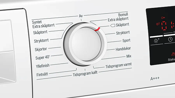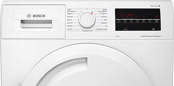 Дисплей в сушильном шкафу расположен вверху фронтальной части и помогает с настройками, а также в коммуникации с устройством. Отображение текста представлено двумя строками с шестью символами в каждой. В процессе сушки на дисплее отображаются выбранная программа, а также загораются различные индикации выполнения процесса.