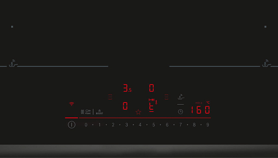 Электронное управление реализовано через сенсорные элементы и систему DirectSelect — интуитивно понятный интерфейс обеспечивает быстрый доступ к девяти уровням мощности для каждой секции, а также к вспомогательным режимам. Для точной настройки режима отображается TFT-дисплей, на котором отображаются выбранные параметры и оставшееся время. Таймер прямого отсчёта позволяет задать продолжительность приготовления для каждой конфорки, а по завершении работы сработает звуковой сигнал и автоматическое выключение соответствующей секции.