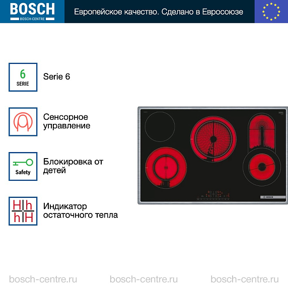 Варочная панель Bosch PKC845FP1D, произведенная в Евросоюзе, представляет собой стильное и функциональное решение для современной кухни. Этот кулинарный помощник, выполненный в элегантном черном цвете, оснащен четырьмя конфорками, что позволяет готовить несколько блюд одновременно. Стеклокерамическая поверхность не только придает панели стильный вид, но и обеспечивает простоту в уходе. Прямой край дизайна придает продукту современный и гладкий вид, идеально сочетающийся с любым интерьером кухни.