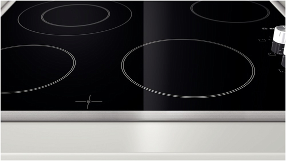 Независимая электрическая панель PKF645C17 дополнена рамкой из нержавеющей стали. На стеклокерамической поверхности располагаются четыре конфорки разного диаметра, одна из которых с двойным расширением. Управление осуществляется при помощи поворотных регуляторов, которые не нагреваются во время работы прибора. Индикатор остаточного тепла повышает уровень безопасности и предупреждает о том, что конфорка еще горячая и прикосновение к ней будет опасным.
