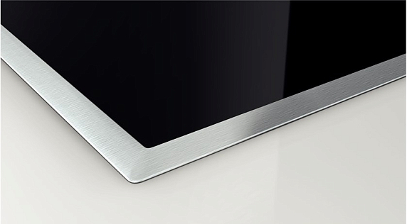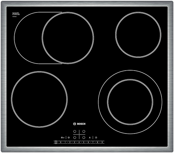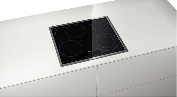 Электрическая варочная панель Bosch PKN 645F17R — независимая встраиваемая модель из стеклокерамики в рамке из нержавеющей стали.