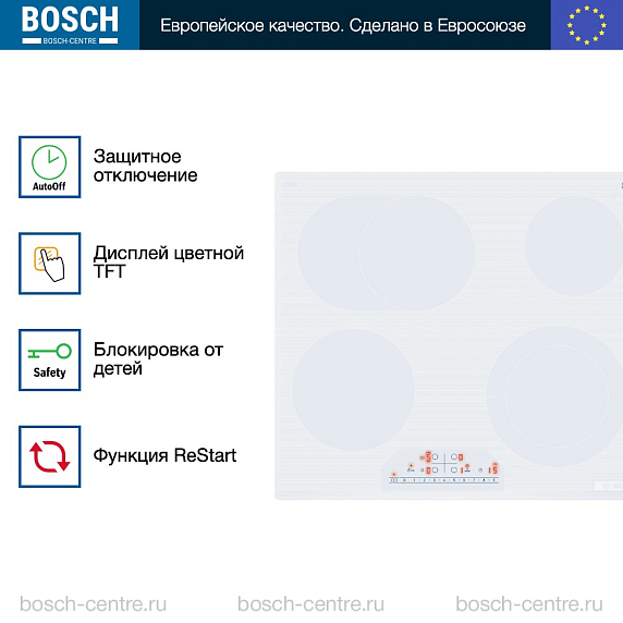 Электрическая варочная панель Bosch PKN652FP2E из белой стеклокерамики имеет независимое управление и предназначена для встраивания в столешницу.