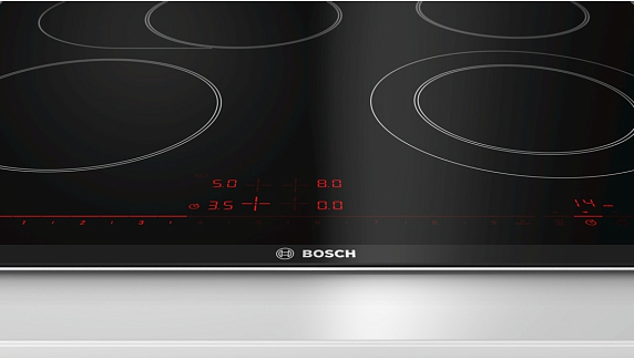 Варочная панель Bosch PKN675DB1D — встраиваемая электрическая модель с независимым управлением. Поверхность из стеклокерамики с двух сторон отделана тонкой полоской нержавеющей стали, сверху и снизу лист скошен и плотно прилегает к столешнице.