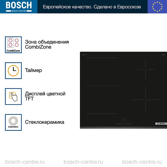 Варочная панель Bosch PVS63KBB5E является высококачественным и функциональным оборудованием, которое станет настоящим украшением любой кухни. Изготовленная в Евросоюзе, эта модель сочетает в себе стильный дизайн и передовые технологии. Сенсорное управление TouchSelect и TFT дисплей обеспечивают удобство и простоту использования. Панель оснащена четырьмя индукционными конфорками, каждая из которых имеет свой таймер прямого отсчёта с функцией отключения.