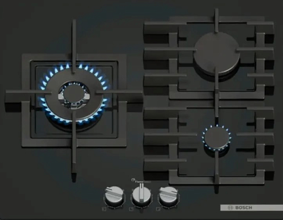 Газовая варочная панель Bosch PPC6A6I40O имеет глубокий чёрный оттенок и идеально ровную закалённую стеклянную поверхность, создающая ощущение минимализма и аккуратности в интерьере. Низкий профиль с высотой 5.4 см обеспечивает плавный переход от столешницы, позволяет сохранить общую линию рабочей зоны и не загромождать пространство. Ширина 59 см и глубина 52 см соответствуют стандартным нишам, что упрощает монтаж и помогает органично встроить прибор в существующую мебельную композицию. Материал варочной зоны не только визуально благороден, но и практичен: закалённое стекло устойчево к механическим нагрузкам и температурным перепадам, при этом его глянцевая поверхность подчёркивает насыщенный чёрный цвет, придавая ансамблю лаконичность и выразительность. Дополняют образ массивные чугунные решётки, которые надёжно фиксируют посуду, создают ощущение профессиональной устойчивости и контраста с гладью стеклянного поля.